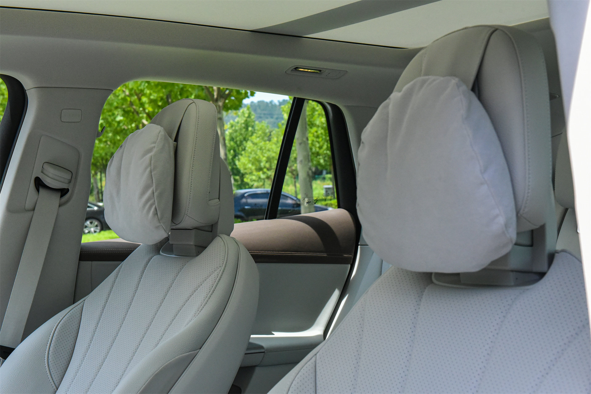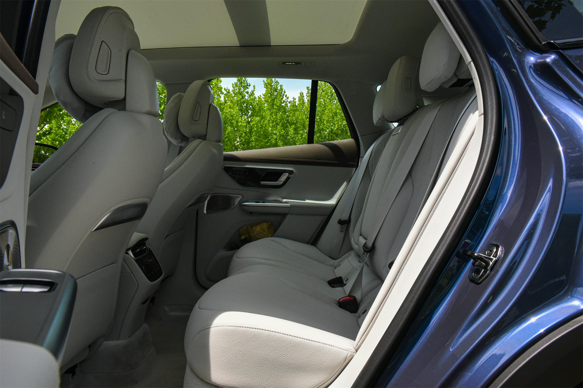 而现在的大多数新车都有大尺寸全景天窗,这玩意在夏天有多热,大家都很清楚。对于走量车来说,可以不管全景天窗的热,但豪华车不能不管,而且必须要做到很好的隔热。这意味着豪华车的天窗遮阳帘厚度得很厚----大概5厘米。这5厘米又占用了大量的车顶空间。所以大家如果留意一下现在的很多和EQE SUV相似尺寸的纯电SUV都会发现,它们尽管车体高大,但坐进去你会明显感觉,整车的空间感似乎没有外观看起来的那么大。