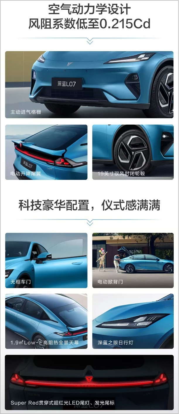 整车空气动力学设计同级领先,主动进气格栅、电动升降尾翼与19英寸驭风封闭轮毂等细节处理,0.215cd风阻系数跻身同级第一梯队。无框车门、1.9㎡Low-E高阻热全景天幕及电动掀背门等电动车标配悉数尽有。灯组组配置方面,深蓝之眼日行灯与Super Red贯穿式超红光LED尾灯、发光尾标共同组成能量灯组,更具未来感与辨识度。