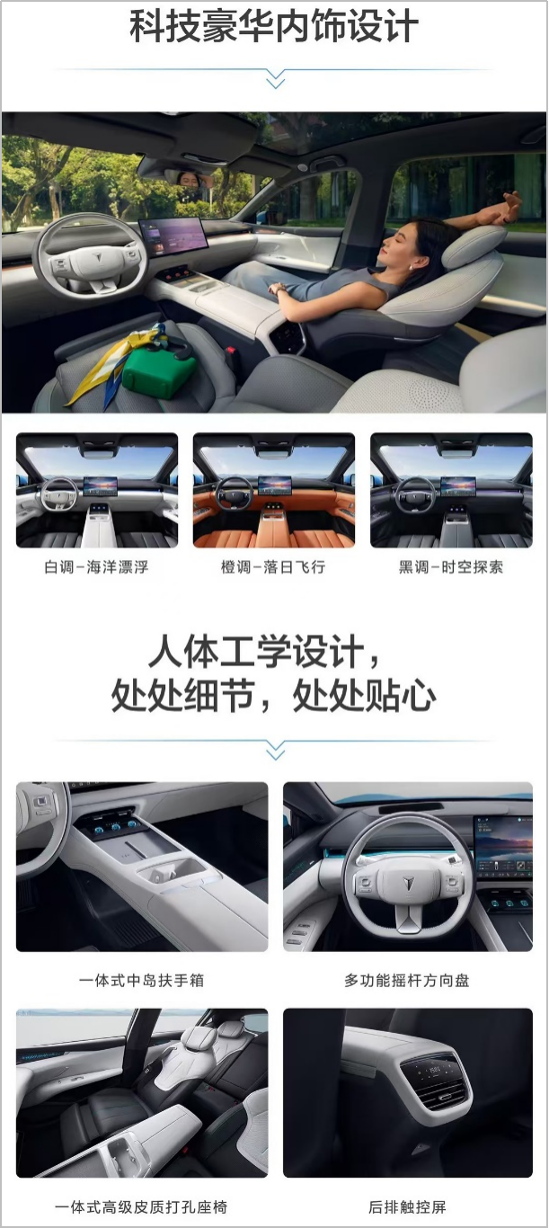 同时,以科技豪华为设计基调,深蓝L07推出白调-海洋漂浮、橙调-落日飞行、黑调-时空探索三大主题内饰风格。从一体式中岛扶手箱、多功能摇杆方向盘,到一体式高级皮质打孔座椅设计、后排触控屏、创意解锁&车窗功能按键布局,极致的人体工学设计。
