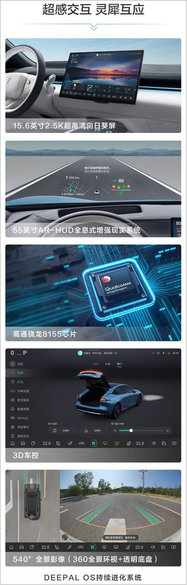 此外,更多智享科技配置细节拉满。传统液晶仪表被55英寸AR-HUD所替代。搭载高通骁龙8155顶级芯片,流畅运行Deepal OS智能操作系统,此外还有3D车控桌面、“你好 深蓝”语音助手等更多智能交互体验配置。2.5K高分辨率15.6英寸超大尺寸向日葵屏;
