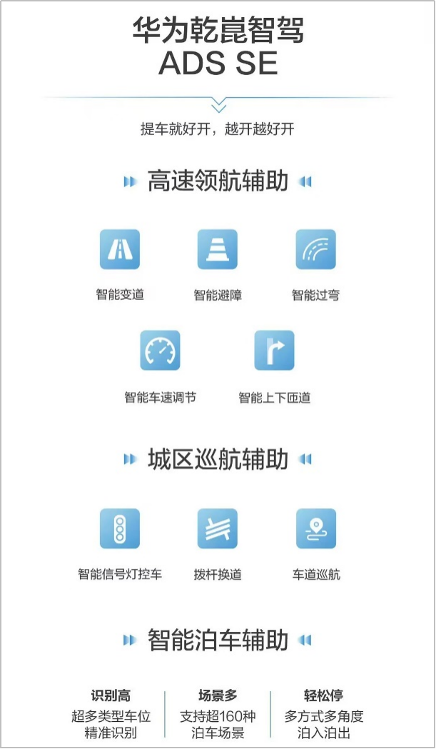 而非乾崑智驾ADS SE版,则提供智能泊车辅助(APA)、遥控泊车辅助(RPA)(OTA后期升级)、集成式自适应巡航辅助(IACC)等功能。