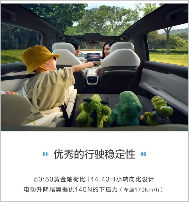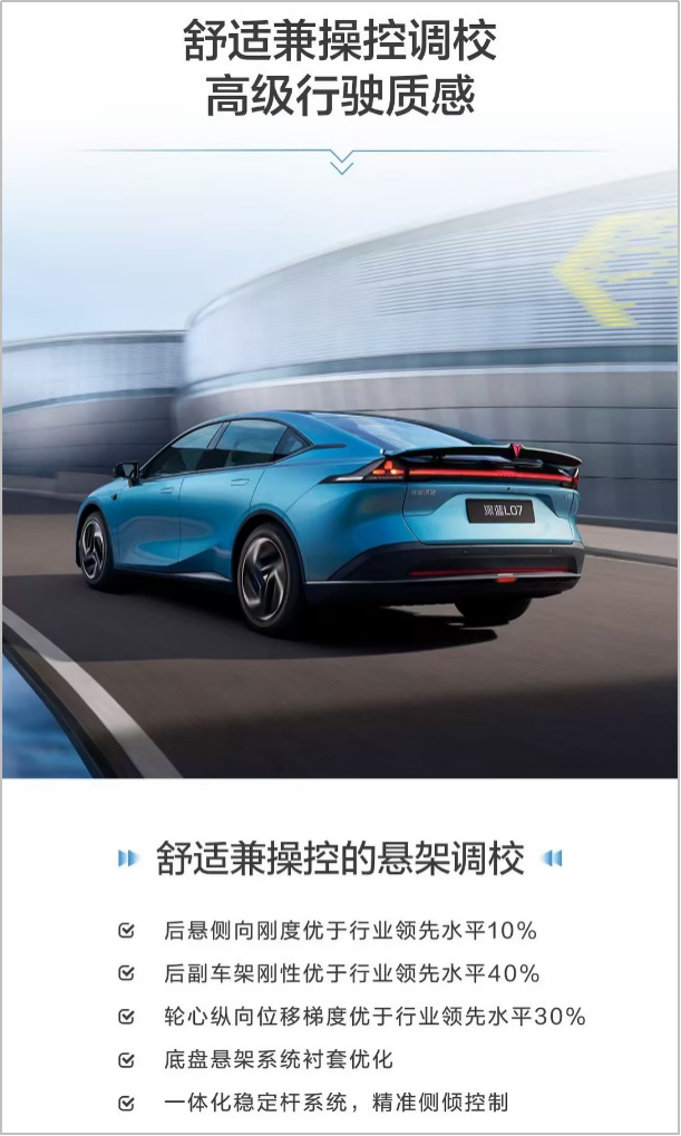底盘方面,深蓝L07悬架调校同级领先,行业顶级大师调校,超200余种减振器方案优中选优,后悬侧向刚度优于行业领先水平10%,后副车架刚性优于行业领先水平40%, 轮心纵向位移梯度优于行业领先水平30%,一体化稳定杆系统,精准侧倾控制。全系新增前摆臂液压衬套解决方案,使悬架过滤更干净,车辆平顺有质感。同级领先50:50黄金轴荷比、精准转向配合电动升降尾翼,行驶更稳定。