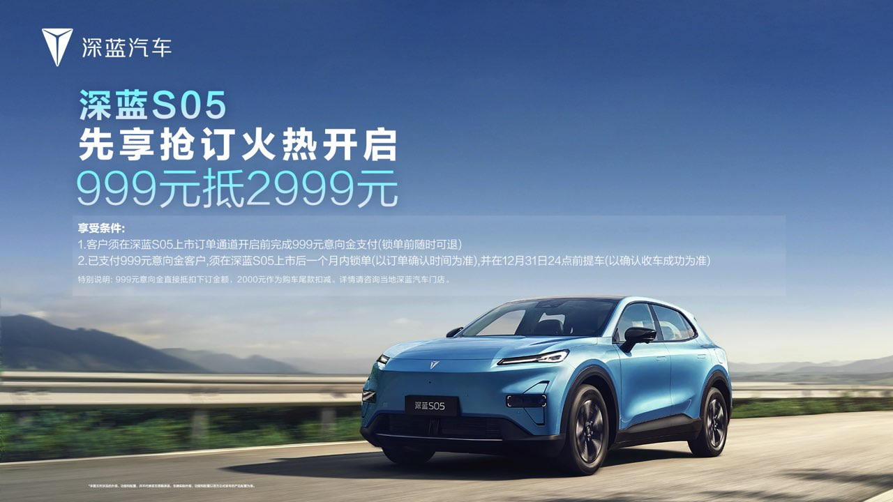 深蓝L07新车上市当天,深蓝汽车同时宣布,旗下首款紧凑型SUV,定位于“多彩生活记录者”的深蓝S05也同步开启先享抢订,即刻下订可先享999元抵2999元购车权益。