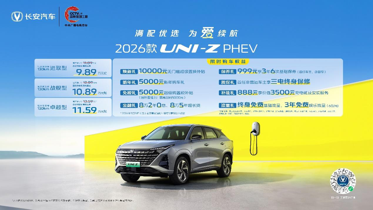 结语:实现动力、舒适、科技三大进阶的2026款UNI-Z PHEV,将采用全系宁德纯电续航130km、2795mm长轴距大空间、天枢智能座舱、超大智慧双屏、豪车级电子怀档、50W无线充电、前排双层隔音玻璃、天枢驾驶辅助视觉版、18项主动安全等集于一身,功能齐全无短板,一步到位不将就,以满配实力树立10万级插混SUV的价值新标杆。此时正值上市限时活动推广期,新车更以9.89万元起的限时优惠诚意价,让2026款UNI-Z PHEV成为家庭用户购车首选。新店已到店,诚邀莅临品鉴,解锁更多幸福出行瞬间。